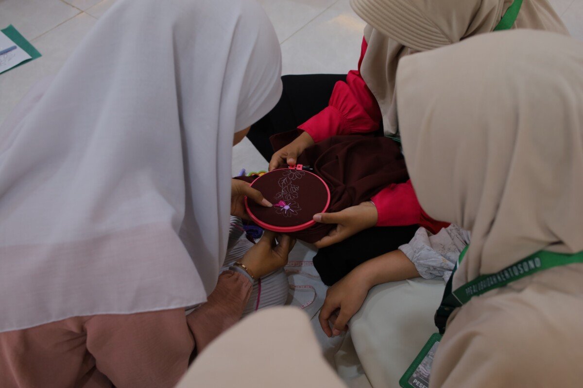 Pelatihan yang dimulai sejak pukul 08.00 WIB tersebut berlangsung dengan penuh antusias. Helai demi helai benang berwarna mulai dirangkai membentuk motif bunga yang indah di atas kain putih. Instruktur pelatihan, Eny Dwi Utami, menyampaikan bahwa menyulam bukan sekadar membuat hiasan meja, tetapi juga menjadi sarana melatih kesabaran, ketelitian, dan ketekunan. “Menyulam mengajarkan santriwati tentang ketelitian dan ketekunan. Satu tusukan yang salah bisa merusak pola, sama halnya dengan menjaga akhlak dalam kehidupan sehari-hari,” ujarnya.